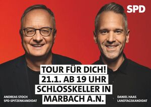 Wir laden alle Interessierten ganz herzlich zu einer öffentlichen Veranstaltung am kommenden Mittwoch, 21. Januar 2026, 19:00 Uhr, in die Schlosskeller in Marbach (Strohgasse 3, 71672 Marbach am Neckar) ein. Es wird dort keine klassische Reden, sondern ein Dialog mit den Kandidierenden geben. Nach dem Gespräch von Andreas Stoch mit den Kandidierenden gehört die Bühne den Gästen für Ihre Fragen. Wir werden auch dort zeigen: Die SPD kümmert sich. Weil es um den Menschen geht, wenn es um Politik geht.
